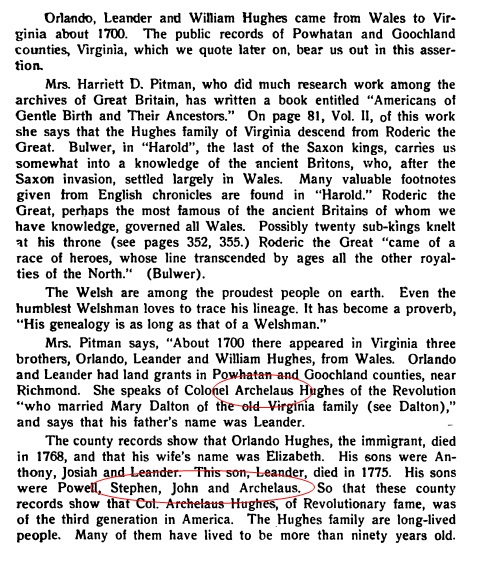 I was born on the 22nd day of February 1800 in the county of Henry and state of Virginia on the East Fork of Leatherwood Creek. My father was a son of Colonel Archelous Hughs of Henry County, Virginia, once Patrick County. My father was a member of the Virginia Legislature for the county of Patrick in 1799. That fall he left Patrick and moved to Henry were he lived till the fall of 1814, when he moved to this state, lived one year in Smith county where I learned the English grammar. He then moved to Williamson County on Big Harpeth 14 miles above Franklin were he now lives. My mother was the daughter of General Joseph Martin of the County of Henry, state of Virginia. He was a captain in Virginia Line in the Revolutionary War. He was agent to the Cherokee Nation of Indians. He commanded the American forces at the battle of Lookout Mountain against the Cherokee Indians. He liked to have been defeated, had a number of his men killed. Represented Sullivan County on the Legislature of North Carolina before this was a state. He was one of the commissioners on the part of United States that treated with the Cherokee Nation of Indians at Hopewell on the Rowie, which was in 1785. He was with others a commissioner on the part of Georgia in the year 1784 to ascertain the quantity, quality, and circumstances of the land in this tract of country called the Big Bend of Tennessee which was then in the chartered limits of that state and to grant warrants of survey. For further evidence on this subject please see the Resolutions of the Georgia Legislature of the 20th of February 1784 and the proceedings of Conegress upon the claims of Mounsey (?sp), Carr, Andrew Jackson, and others accompanied with a Bill for the benefit of Thomas Carr and others December 14, 1819. He was one of the Commissioners on the part of Virginia to settle the boundary line between this state and Virginia. He was for many years a member of the Virginia Legislature from Henry County, and would only lose from three to ten votes in the county. He was at the time he died a Brigadier general of the militia for the Brigade in which he lived. He retained his popularity till his death. He was twice niarried. He had by his first wife, who was Sally Lucas, two sons, William and Brice, and five daughters by his first wife. His second wife was Susan Graves by which he had eight sons and three daughters. His oldest son, William Martin, was a member of the Georgia Legislature for some years, one of the first settlers of Smith County in this state, represented it in Legislature. Was Colonel of the Militia of Georgia and also Colonel in the Creek War of 1813. He commanded as such at the Battle of Talledega, ect. Elector of President and Vice-President several times from the district in which he lives, A commissioner on the part of this State for the adjudications of land warranty in 1819-1820 counties in which they lived. The other one, Major Britt Stovall was surveyor of the County of Patrick, which office he holds now. Major John Fulkerson, who married Jane Hughes, second sister, for many years represented Lee councy in the Legislature. Colonel Joseph Martin, my mother's brother, married the third sister of my father, Sally Hughes. Brig. Gen. John Dillard of Henry County, Virginia, married my father's youngest sister, Matilda Hughes. He was a member to the Legislature of Virginia from that county during the late war, and sometime after commanded a volunteer artillery Company at Crany Island near Norfolk for six months during the late war, since which time he has been Colonel of the County of Henry and was about two years since elected by the Legislature of Virginia, Brigadier General of the Brigade in which he lives.