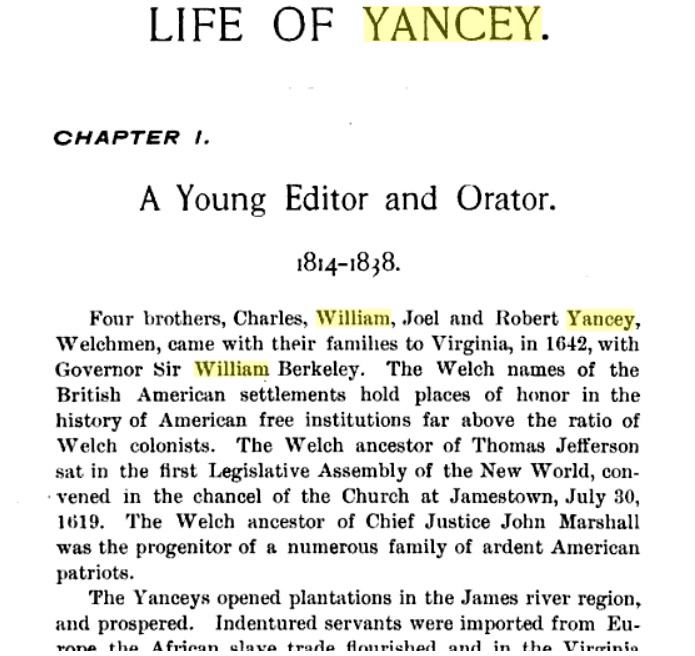 Virtually every branch of the Yancey family has passed down the story of various Yancey brothers from Wales coming to America with Sir William Berkeley in 1642. Researchers for over a century have been befuddled by this story – because any evidence of it seems no where to be found – and the earliest documented Yancey is Charles Yancey in 1704 (60 years later – with not one jot or title of Yancey info between) . The very first RECORDED story the Yancey’s connection to Sir William Berkeley appears to be the biography of William Lowndes Yancey in 1892. Contrary to many other biographies of the time – his biography had very wide distribution. As genealogical research on the Yancey family began in the late 1800’s and early 1900’s by various members of the family - - - they all seemed to find the biography of William Lowndes Yancey as they visited major research libraries – and included with their early family histories the account of the Yancey origin by William Lowndes Yancey’s biographer. The truth is William Lowndes Yancey – had virtually no first hand knowledge of his family history – and virtually none coming from his father – who died when he was young. Growing up he knew extremely little about his family origin. It was only later in life that he searched out some of the history from distant new found cousins he had established contact with. His biographer also attempted to make contact with Yancey cousins – with some success. The little that they were told about the Yancey origin was included in William Yanceys biography - - - but I don’t think anyone considered it a set of facts that had been authenticated by primary research – just what they had been told by people they contacted. When anyone compiles a family story – almost without exception – the part of the story most likely to have errors or twisted truths is the story of family origin or its earliest recorded ancestors – which often isn’t backed up by any primary facts – just stories that have evolved over the generations.
