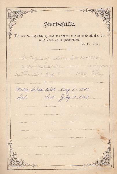 Dorthy May Schaadt May 16, 1926 Sunday 12 pm noon.
