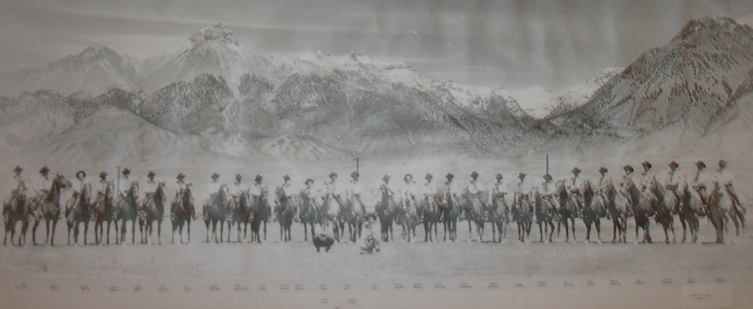 Members on horses (L to R): Milt Eberhart, Max Kendell, Sherm Duffin, Waldo Kendall, Clair Hawes, Dub Thornley, Al Larson, Lenard Phillips, John Chamberlain, Buck Jones, Ralph Kendell, Nate Turpin, Jack Slaugh, Ross Babb, Tom Dunn, Leland Clinger, Byron Nelson, Carl Richards, Vern Stambaugh, Wayne Kendell, John Duffin, Roland Duffin, Don Dancliff, Paul Kendell, Maila Armstrong, Ode Wafford, Harvey Phillips, Ferd Dalke, Hassell Vargason