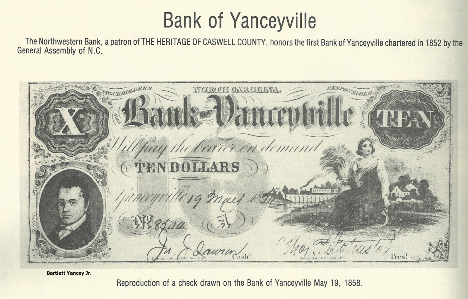 An old Bank note from Caswell County North Carolina with Bartlett Yanceys picture on it: