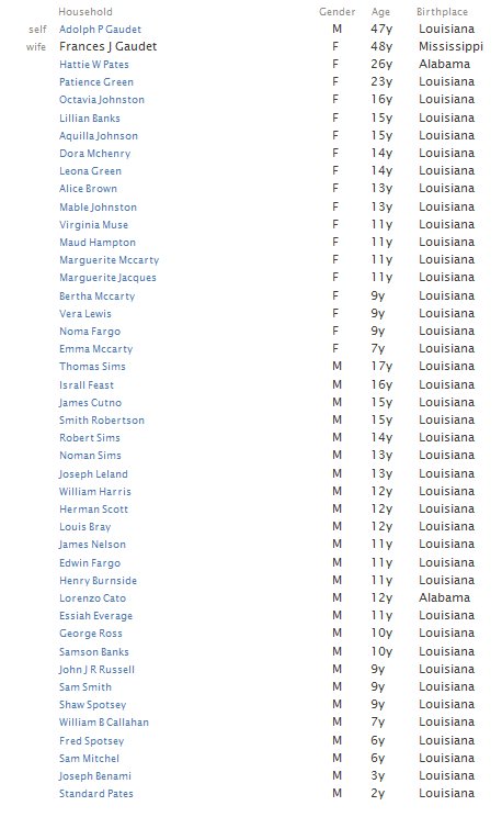 Frances and her husband Adolph Gaudet and numerous children in their 1910 household