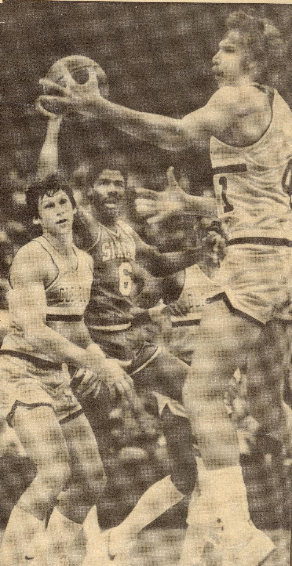 STEVE HAYES GRABBING A REBOUND IN FRONT OF DR. J JULIUS ERVING AND GUARDING MOSES MALONE IN A PRO-GAME