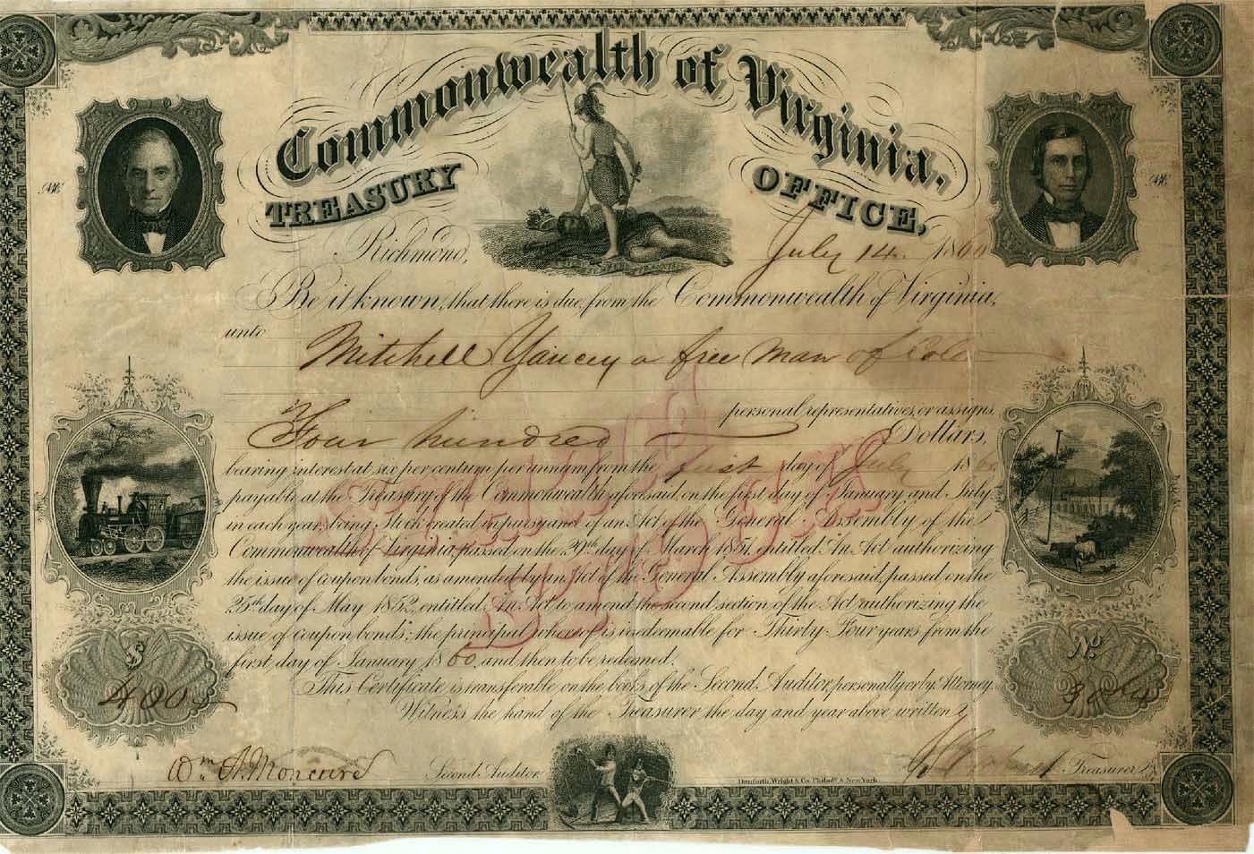 A RARE VIRGINIA STOCK CERTIFICATE ISSUED TO A FREE MAN OF COLOR IN 1860 THAT WAS TAKEN FROM THE VIRGINIA TREASURY BY A UNION CHAPLAIN ON THE SURRENDER OF RICHMOND IN 1865 WITH A SECTION OF THE LAST CSA FLAG FLYING OVER RICHMOND 8280 - A most unusual Confederate bond, a Commonwealth of Virginia State Stock (in red) (Criswell #61A), July 14, 1860, incredibly made out to: "Mitchell Yancey a free man of color..." The bond, recovered from the Confederate Treasury only days after the city fell, bears an attached 2" X 8" section of the last flag to fly over the Confederate capitol building. The flag had been captured by American soldiers and divided among them with Union Chaplain John O. Foster, the first Union chaplain to preach a sermon in the newly - "liberated" city, also receiving a section of the huge flag. This stock certificate, along with many other stocks and bonds, were taken from the Confederacy Treasury only days after the city fell by Foster, who had been present at Richmond's capitulation, and his visit to the Treasury is noted in his diary. Foster also noted that the section of fabric he had obtained had been part of the Confederate flag that had flown over the Confederacy's capitol building. Some staining at right with a weak, somewhat brittle fold thereat, hand-cut with uneven margins (as is usually the case), still quite good. Documents included picture Foster's note showing the flag's origin, with additional copies of his diary transcript, biography, analysis of the flag material, and so on. Our genealogical research shows that according to the 1880 census, a mulatto named Mitchell Yancey was born ca. 1834, most likely in Virginia, and in 1880 was employed as a "Waiter in Family." He was married to "Charlot" and had four children between the ages of 7 and 21. His two sons were listed as being a Servant and a Porter in the 1880 census. Born in 1834 Mitchell was 26 when he purchased this bond in 1860. The census of 1850 showed a Benjamin Mitchell Yancey [1809-1901] owning 14 slaves in Virginia. It is quite possible that this Mitchell Yancey was a son of the above slave owner and was emancipated by his father when he became 21. It is interesting to speculate where Mitchell received $400 to invest in the State of Virginia stock certificate paying 6% interest. It was possibly money given to him on his emancipation by his father or money he earned during his early years of freedom. How it was found in the Virginia Treasury in 1865 is another question. Possibly due to the war Yancey redeemed his stock for Confederate notes or bonds. Nevertheless this certificate is rare to begin as far as Virginia financial instruments are concerned and being issued to a FREE BLACK MAN and being glued to a piece of the last Confederate flag taken off the state capital increases its rarity and value significantly. This bond catalogued $300 in Criswell in 1980 and is rated Rarity 9. Bond comes with the entire provenance of the finding of the bond and application to the flag remnants by Chaplain Foster, possibly an unique example.........................................................SOLD