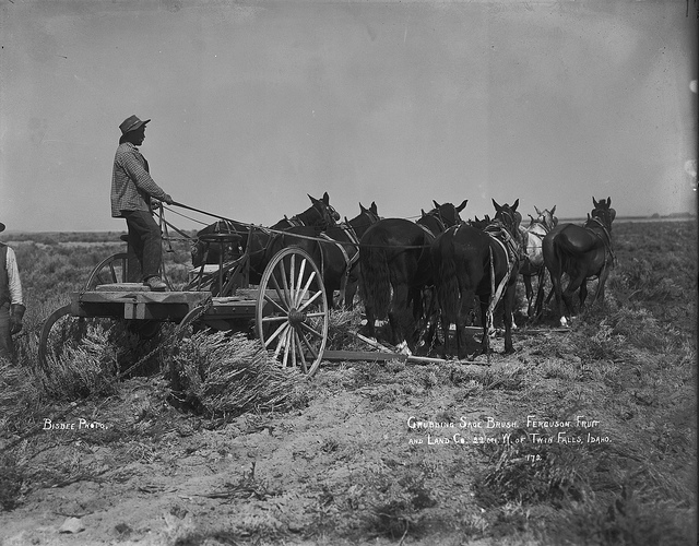 Grubbing the sagebrush from the desert soil using horse drawn equipment - and