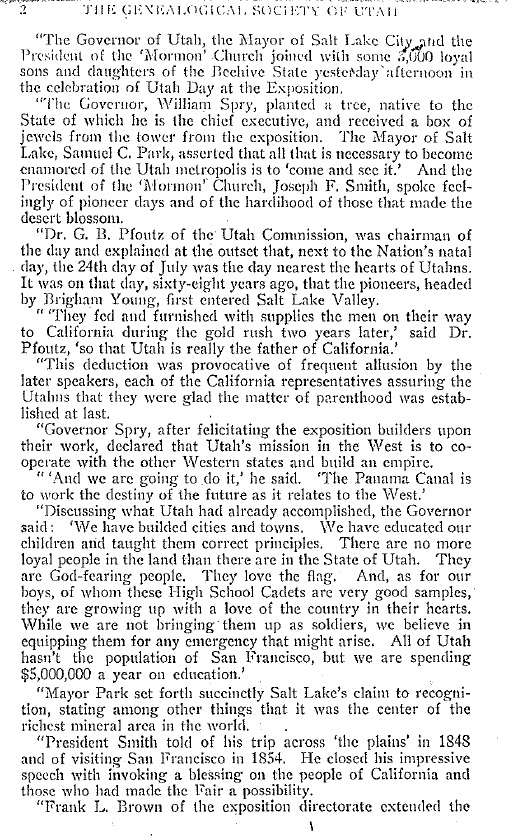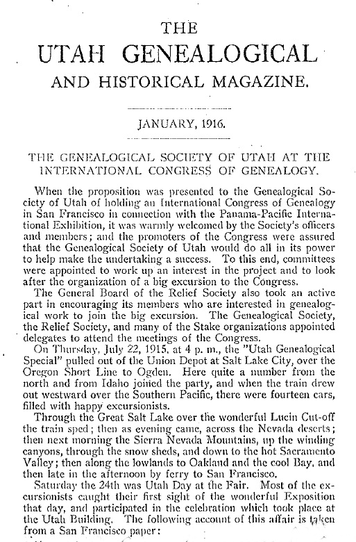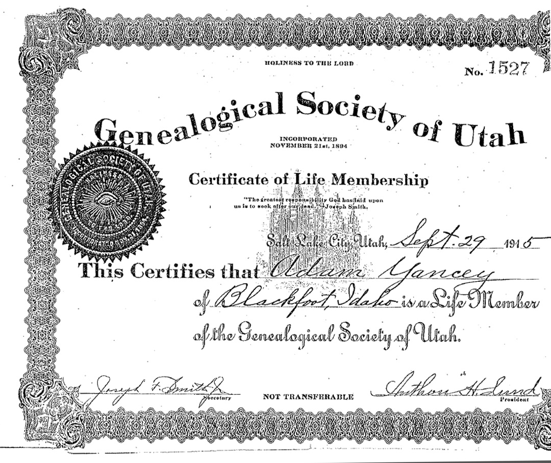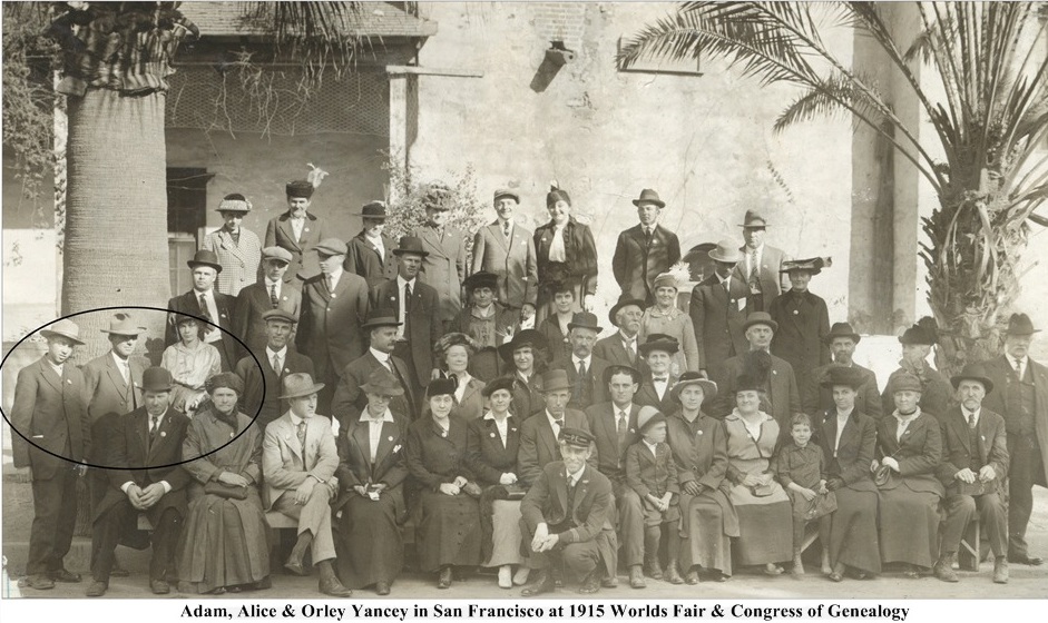In 1915 Adam Yancey with wife Alice & son Orley - were part of the "Genealogical Train" - a group of a few thousand church members that traveled by train to San Francisco, California to the 1915 Worlds Fair - at which the church took part in the "International Congress of Genealogy".