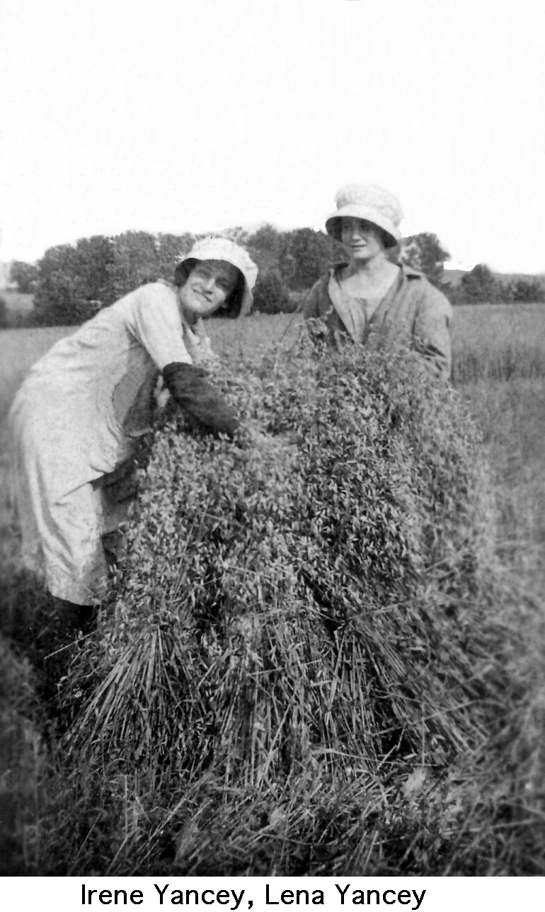 Irene Yancey and Lena Yancey, youngest daughters of Michael & Mary Yancey at their farm near Lyons, Indiana.. The girls are stooking oats during the oats harvest. Irene appears smiling in most photos.